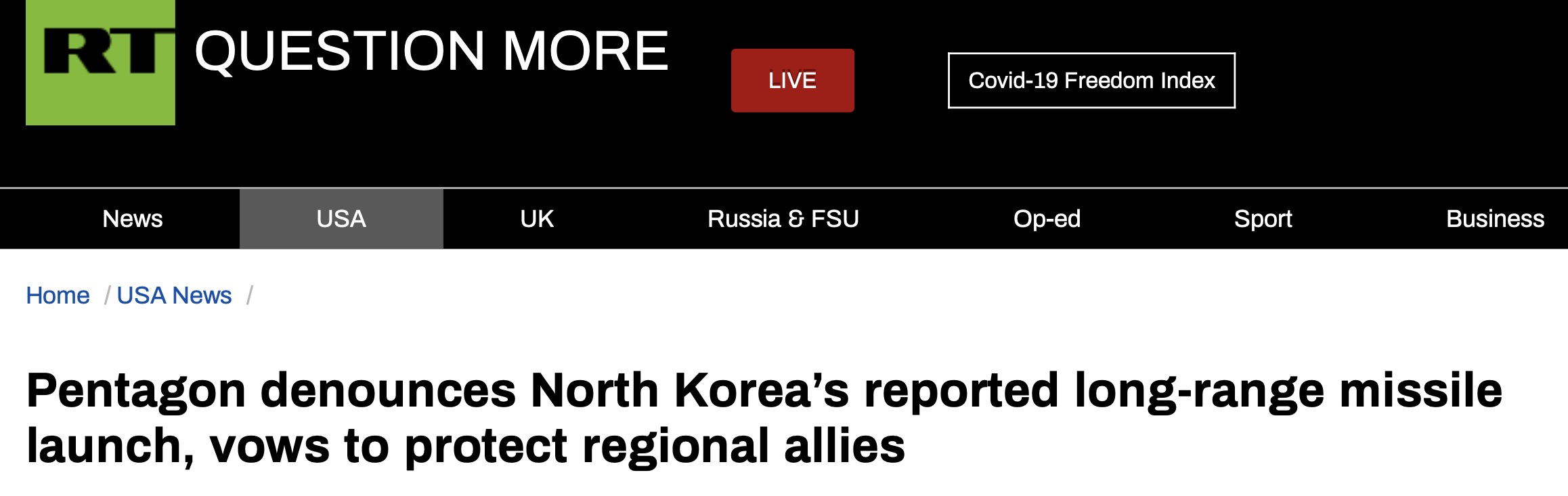 RT称,就在朝鲜宣布成功试射后的几个小时,五角大楼表示已了解有关报道。五角大楼印度洋-太平洋司令部还发表声明称:“我们将继续监测局势,并与我们的盟友和合作伙伴密切磋商。”