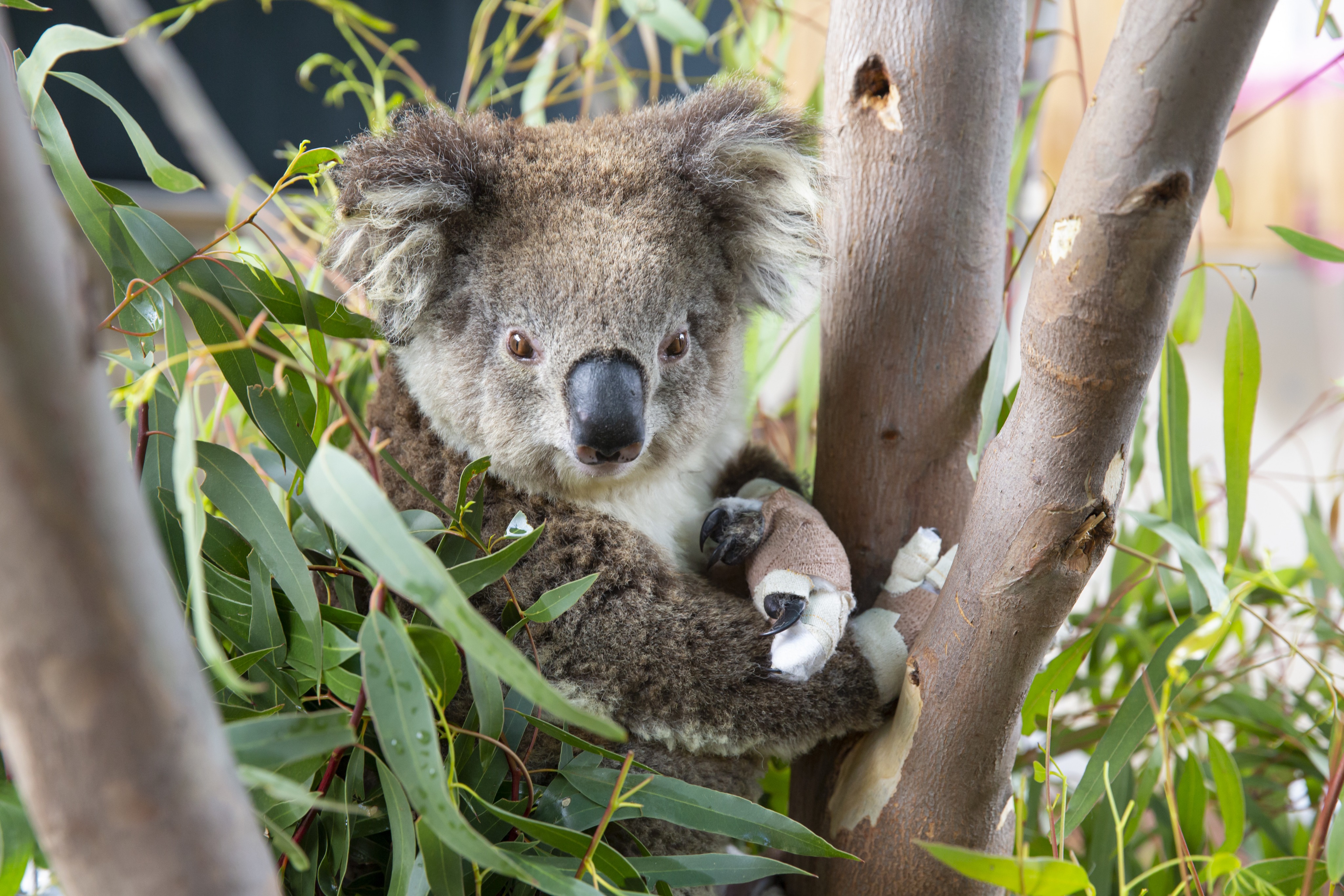 2020年12月6日,在澳大利亚维多利亚州墨尔本动物园,一只绑着绷带的考拉坐在兽医诊所旁的树丛中。新华社发(澳大利亚维多利亚州动物园供图)